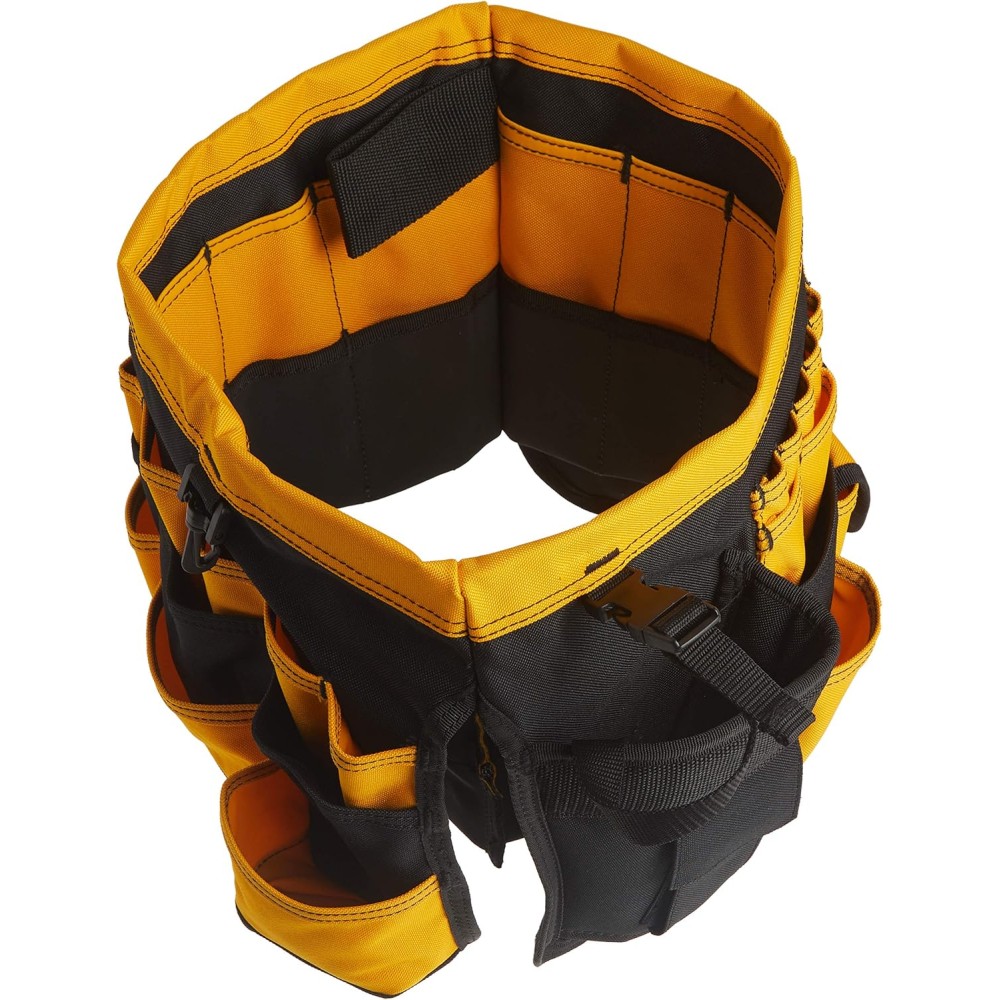 Premium quality 61 pocket bucket organizer in 600D rip-stop polyester with 36 triple-row exterior pockets and 25 double-row interior pockets, and includes a cordless drill pocket with a side release buckle securing strap.