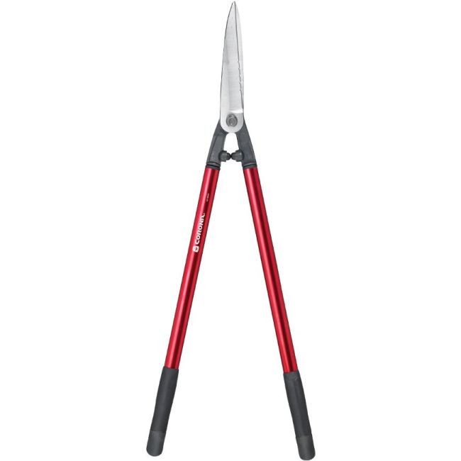 The Corona Clipper forged aluminum long handle hedge shear features 8.5-inch forged serrated blades and 21-inch aluminum handles. The forged steel alloy blades are re-sharpenable, perfect for multiple-season use, and there's a convenient limb notch in the lower blade. The lightweight, high-strength elliptical aluminum handles sport comfortable non-slip grips, and feature a bumper cup with a ShockStop bumper for reduced shoulder fatigue.