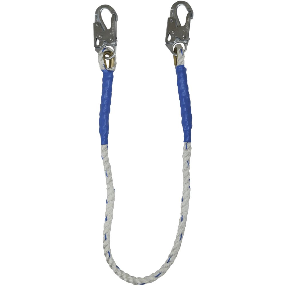 The 6-Foot Rope Restraint Lanyard features single-leg construction and utilizes 5/8-inch 3-strand polyester rope for resistance to UV light and abrasion, with a tensile strength of 8,500 pounds. This lanyard also features double-locking snap hooks at the attachment and anchorage ends. Both ends feature a steel thimble for extra resistance to wear, and the rope end terminations feature a 5-tuck splice.
