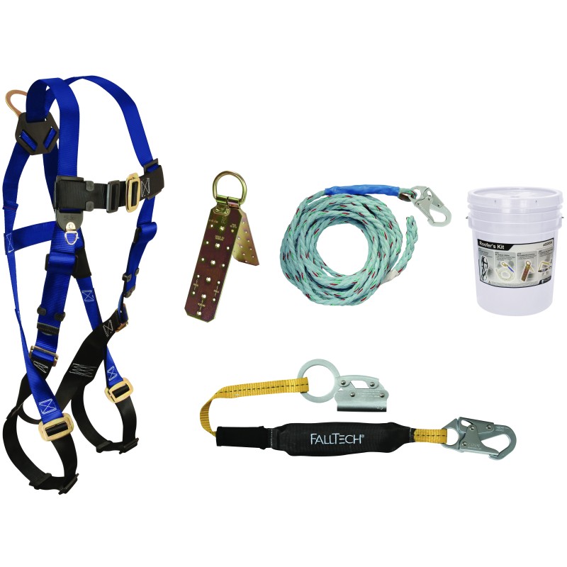 Basic roofer's kit contains #7007 harness, #7149 3-strand 50' vertical lifeline, #7353LT 3' SoftPack shock-absorbing lanyard with integral alloy-steel manual rope grab. Also includes our #7410 hinged, reusable roof anchor and comes packed in a 5 gallon bucket for storage.