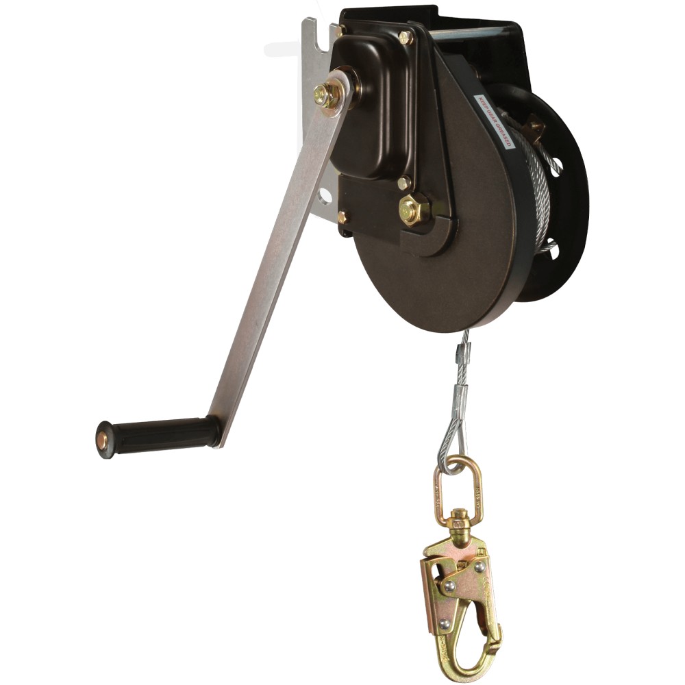 Falltech 60 ft Materials Winch features rugged alloy-steel construction and utilizes a 3/16" galvanized steel cable . Includes double-locking swivel snap hook and mounting bracket.