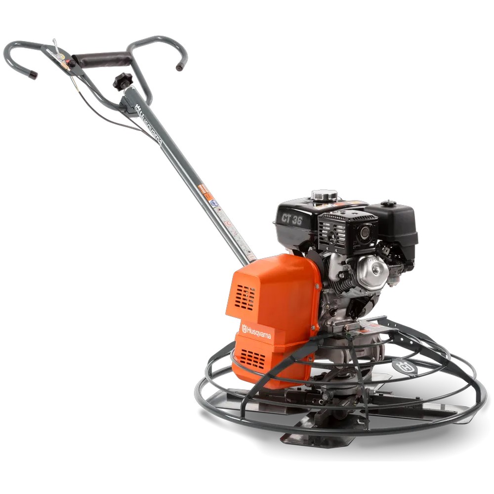 The Husqvarna CT 36 walk-behind trowels feature a trowel diameter of 36 inches and are ideal for finishing medium-sized areas. The trowels are optimally balanced, therefore they can be effortlessly controlled in the wide range of speeds. The transmission brake, electronic safety switch and engine speed sensor offer additional triple protection for the user. In an emergency situation the device will simply switch off and the handle will come to a stand-still after no more than a three-quarter turn. Furthermore, the unit will only start if the throttle lever is set to zero. This prevents an inadvertent rotation of the handle on start-up.