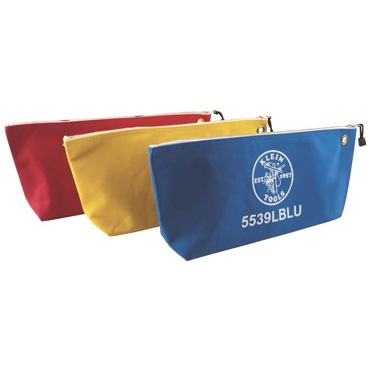 The Klein Tools Large Canvas Zipper bags are perfect for storing large hand tools and materials. This set includes three different colored bags (red, yellow, blue) for organizing by specific job tasks. The 3.5-Inch (89 mm) wide bottom allows for stability when standing and easy access when open. Constructed with tough No. 8 canvas and heavy-duty brass zipper and grommet for added durability.