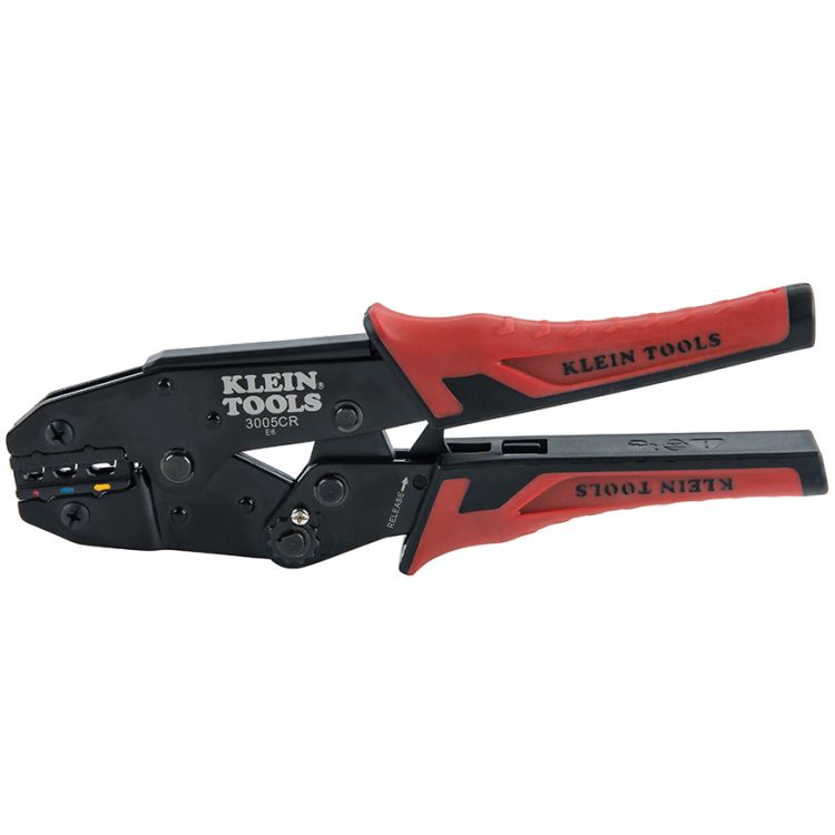The full-cycle Ratcheting Crimper crimps 10-22 AWG insulated wire terminals. This tool features three crimping cavities in one tool with color-coded wire markings for three size ranges of insulated terminals. Crimper design provides low effort to crimp while maintaining a high terminal pull-off force. Built-in ratchet ensures full-cycle crimping for a uniform crimp every time. Compound lever-action of narrow-span handles puts more crimping power into each squeeze. Comfort grips help reduce hand fatigue.