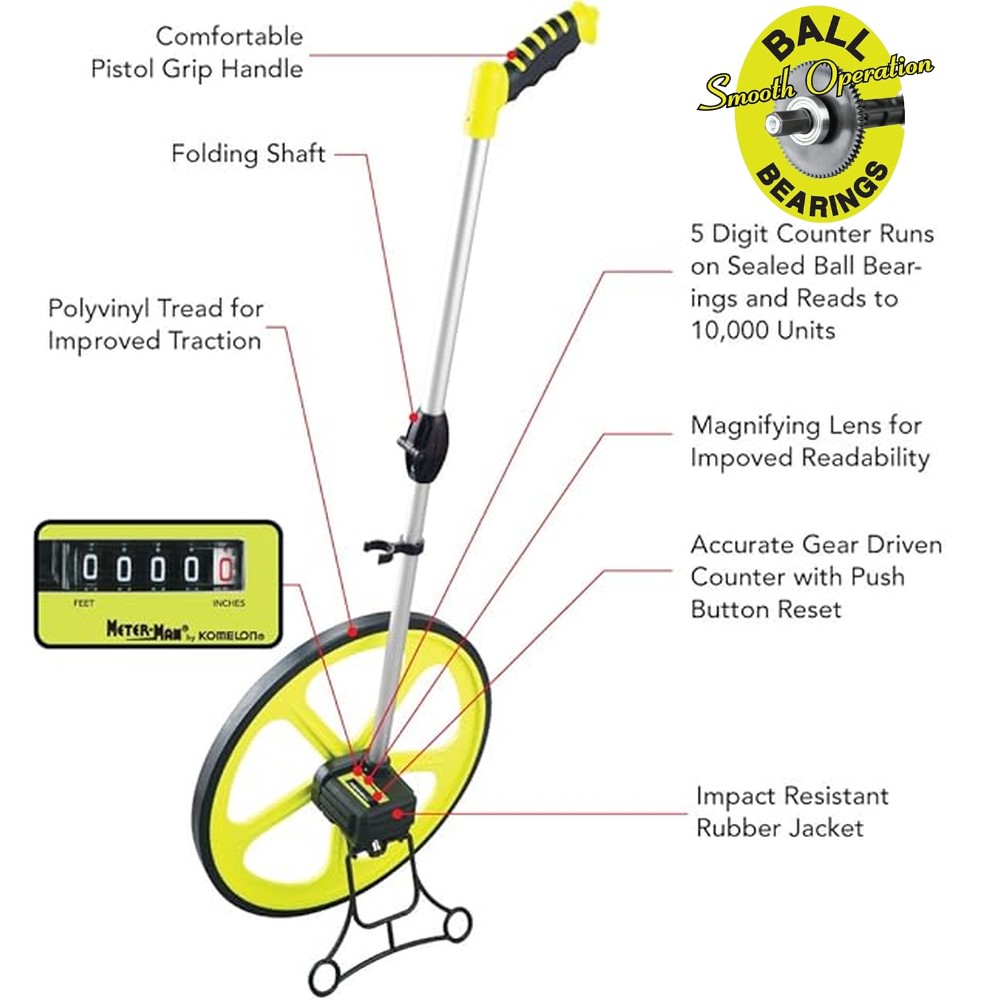 The Komelon 14.3 inch diameter measuring wheels are perfect for almost any outdoor use. They have a comfortable pistol grip, telescoping handle, accurate gear driven counter, and a kickstand. While it is durable enough for outdoor use, it also has a composite tread to help improve traction on smoother surfaces. The 45 series wheel will stand up to any measuring job you throw at it.