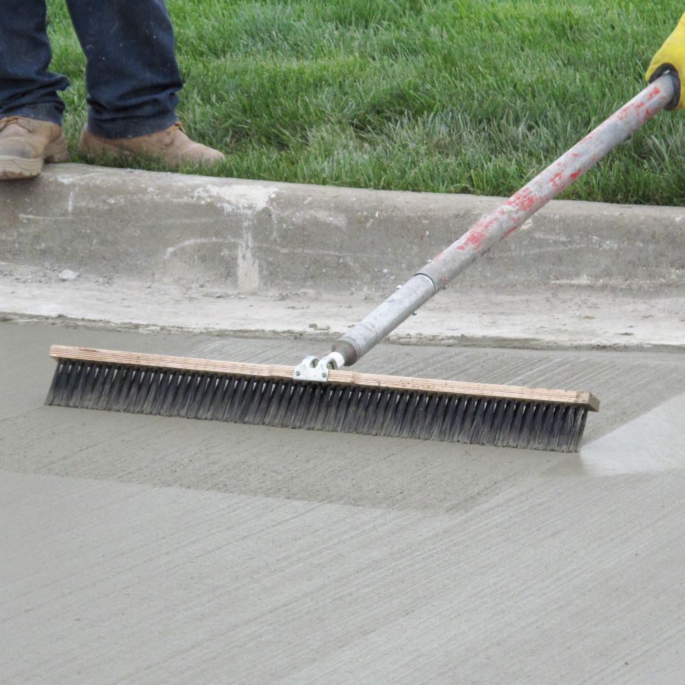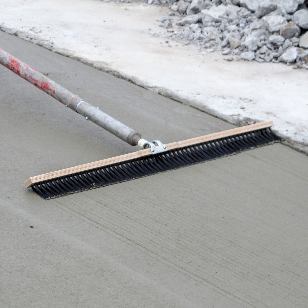 Brush down newly poured concrete after floating with these black nylon bristles to provide a fine finish. Popular for finishing sidewalks and driveways or wherever a finish with some traction is desired. Three rows of long-wearing 3" bristles are set solidly in the laminated wood base. The 36" base is smooth for use by hand in small spaces and touch ups. A metal handle bracket fits around the base and protrudes at an angle for natural push sweeping motions.