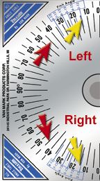| The TAT60 protractor uses a split scale which shows both angle degrees and pitch to indicate the same measurement regardless of a left or right saw boom position. As seen below, the red arrows represents a 45° cut, which is equal to a 12/12 pitch, while the yellow represent a 3/12 pitch. To setup, simply rotate saw boom until the indicator mark on the side of the base aligns with the desired angle then firmly lock saw boom. Note: Always check the mark to ensure correct measurement. |