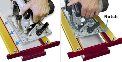 | 4. N ote: Complete this optional step only if tracks are lowered and additional support under rails is desired. First, notch out each rear fence to a point even with bottom of rails. Once you are ready to make cuts, position the saw boom at the desired angle and lock in place (see examples on page 3). Next, loosen each rear fence and position notches under each saw track (to help prevent saw tracks from sagging). Remember to loosen rear fences and slide out of the way before repositioning saw boom. | ![]() |